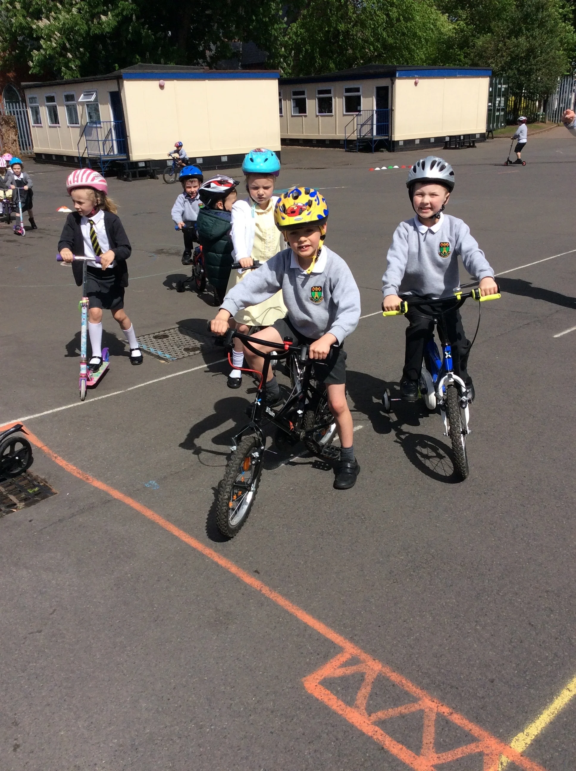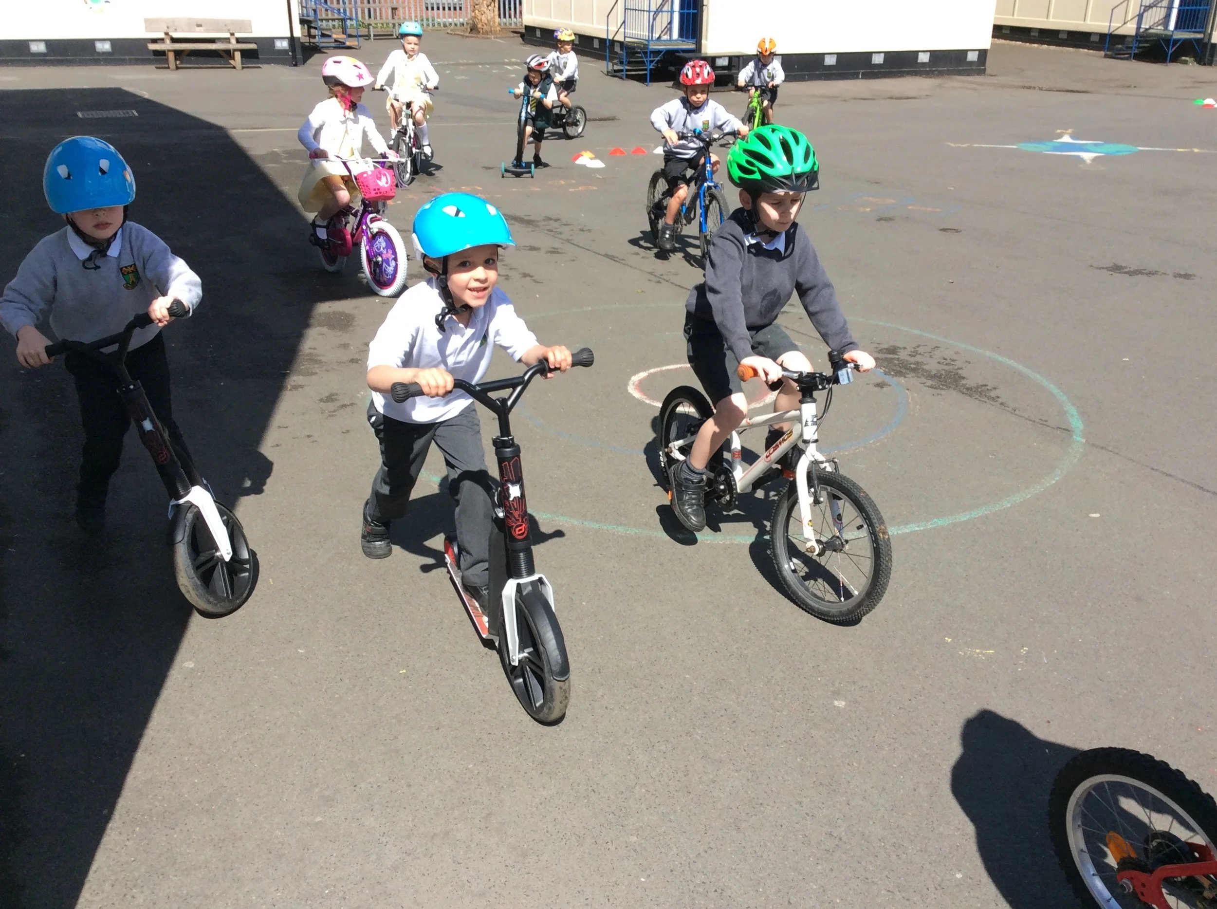 Bike it fun on our bikes and scooters. We talked about bike safety and the importance of always wearing our helmets. We had to use our starting positions to pedal up the hills and use our brakes when coming down. We followed a circuit around the playground. It was great exercise!